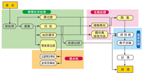采用化學和物理相結合的原則進行污水處理,化學部分主要為加藥反應,物理部分主要為過濾和吸附。